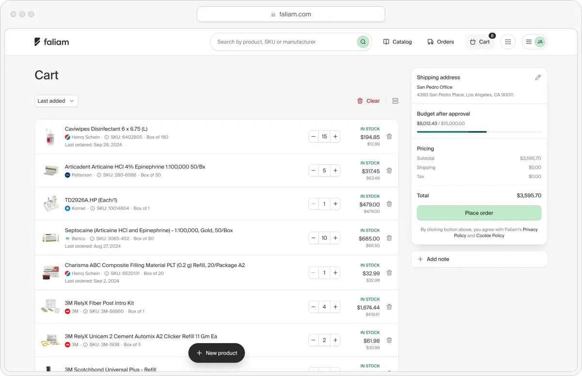 Use Faliam’s intelligent procurement dashboard to compare, control, and complete all orders from one screen. No more spreadsheets or chasing down prices.